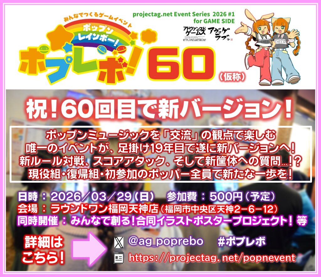 ポプレボ!60 開催決定!! 投稿者: ポプレボ!運営チーム 投稿日: 2026年2月5日 in イベント告知、更新情報 大変お待たせいたしました!2008年から開催を続けていますポプレボ!、2026年3月で遂に60回目の大台に突入!そして、今回から新筐体での開催とあって、様々なポッパーの皆さんが集まり、お祭りになる事間違いなし!! 詳細につきましては、下記リンクよりご確認下さい!! ポプレボ!60